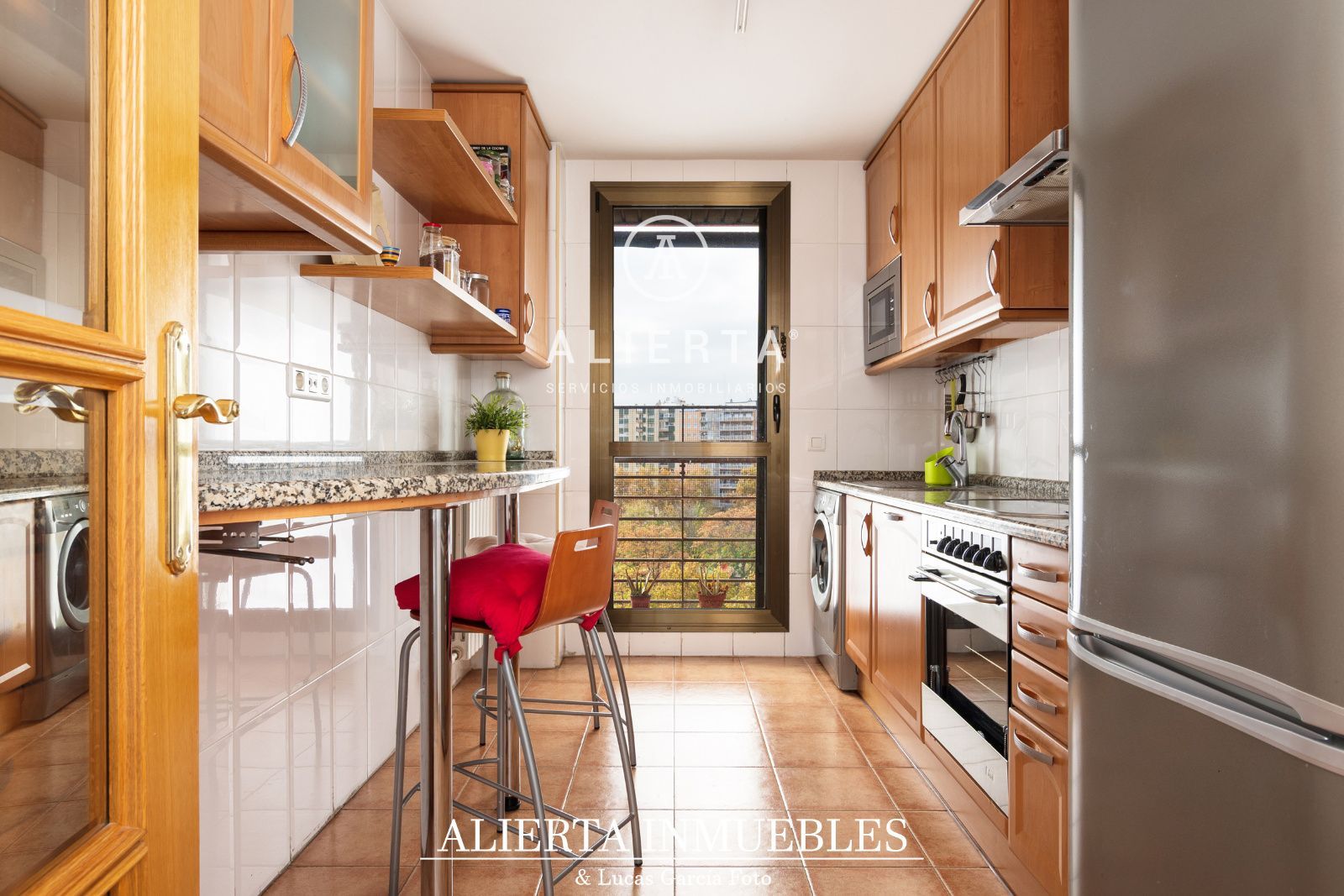 Vivienda en planta alta, exterior, con terraza y vista despejada a zonas ajardinadas. Superficie de unos 90 m2 útiles con muy buena distribución; amplio salón comedor con grandes ventanales de unos 22m2, tres dormitorios con armarios empotrados, uno de ellas tipo suite con baño. Otro baño completo. Cocina con gran capacidad de almacenamiento, equipada con una amplia mesa de granito, acceso a galería y zona de tendedor.