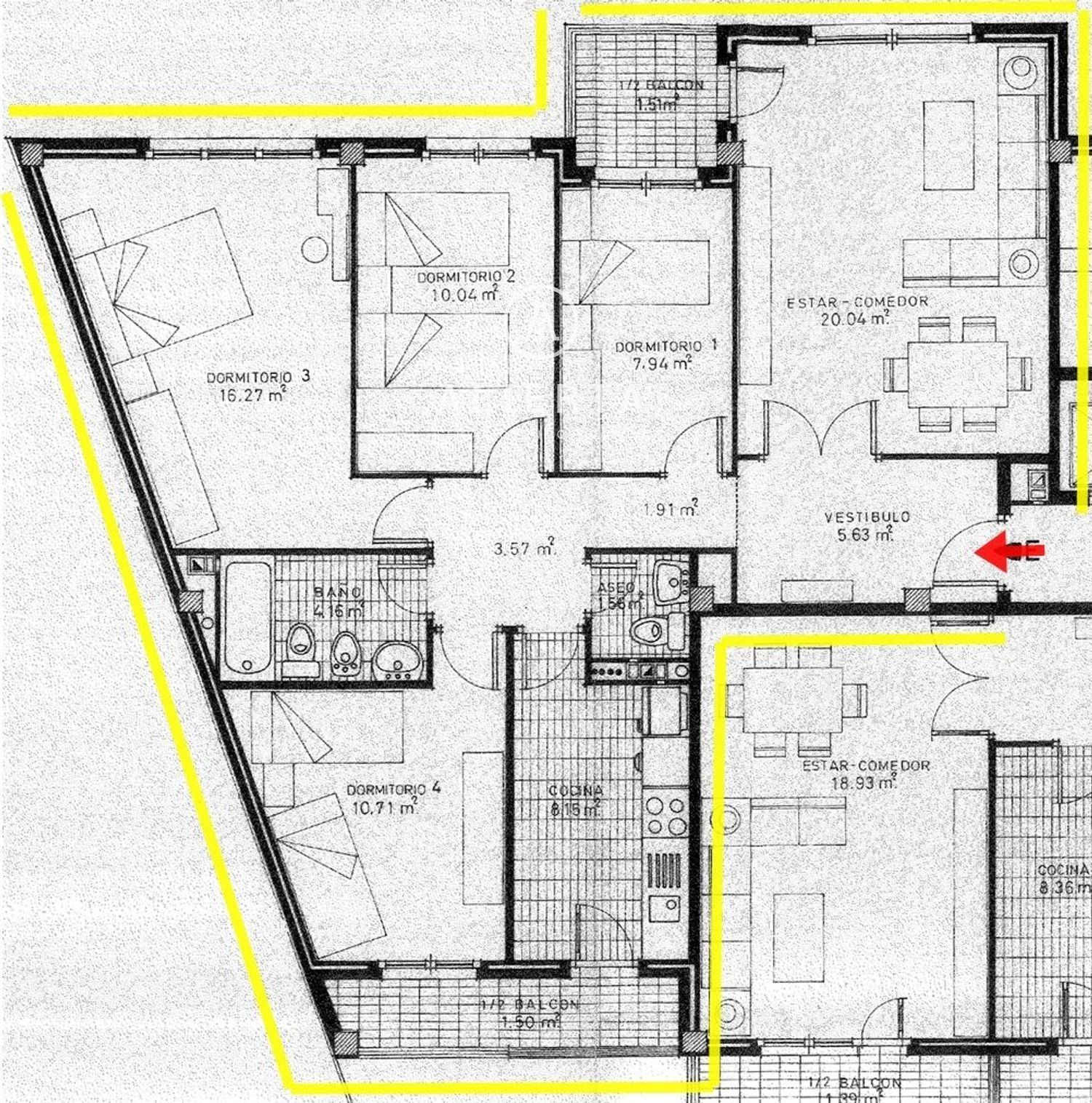 Superficie de unos 90m2, hall de entrada, salón con salida a terraza, 4 dormitorios, en el que el principal tiene un gran armario empotrado, al igual que otro de los dormitorios que aloja la vivienda, baño completo y aseo, cocina completa.
