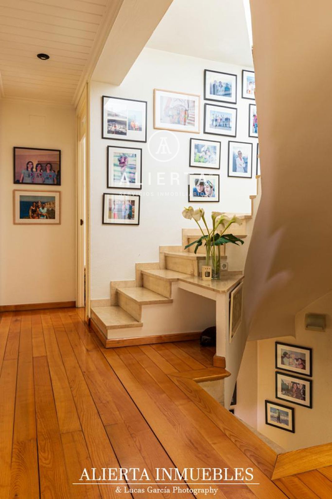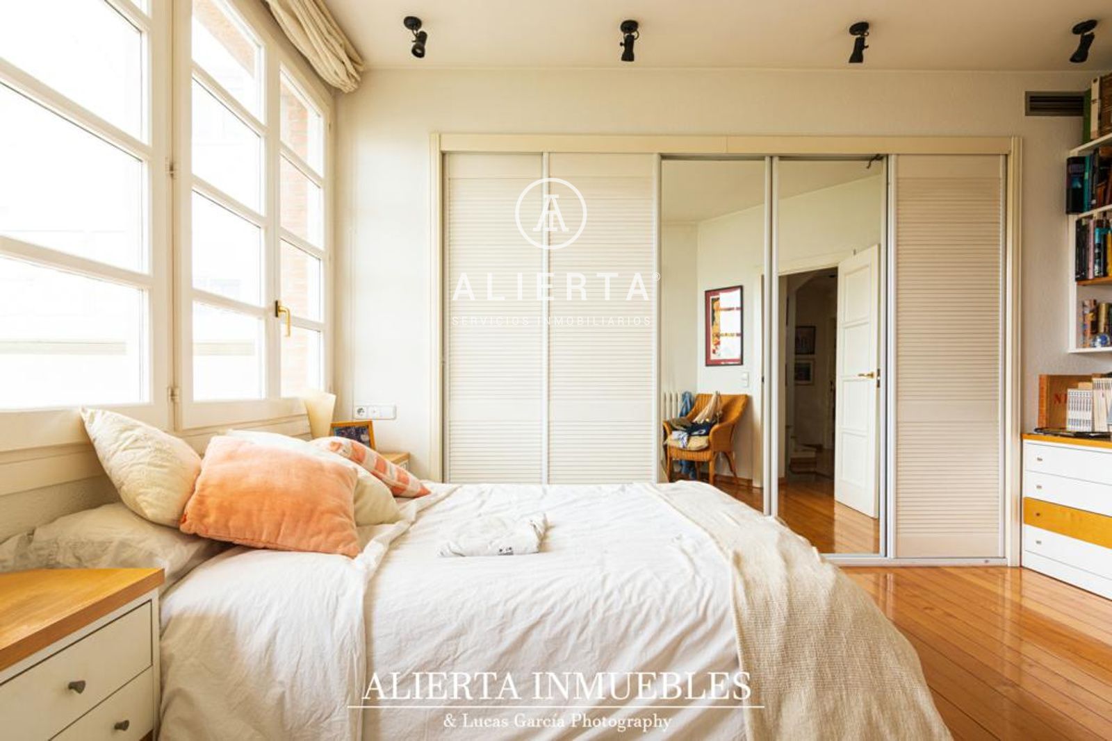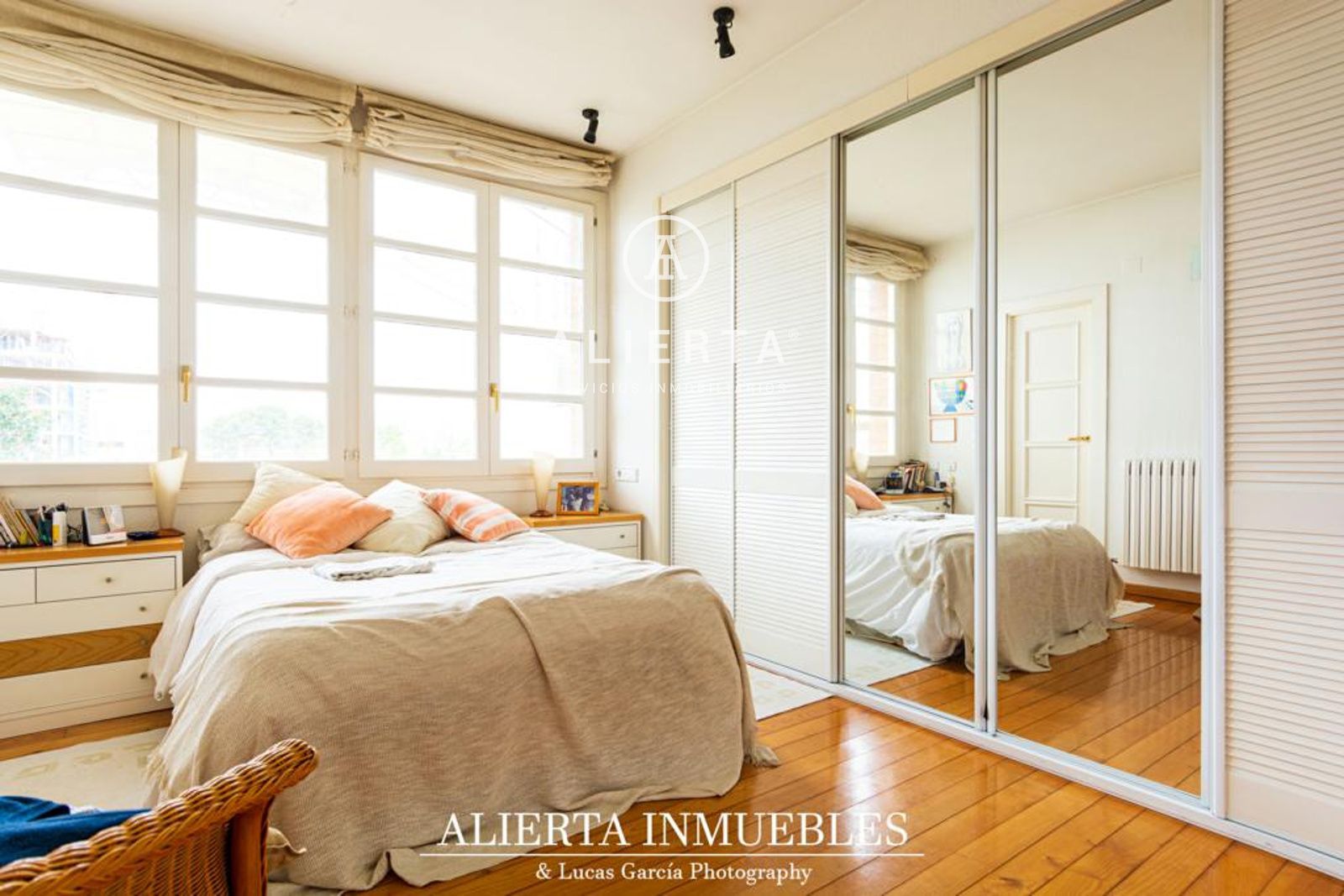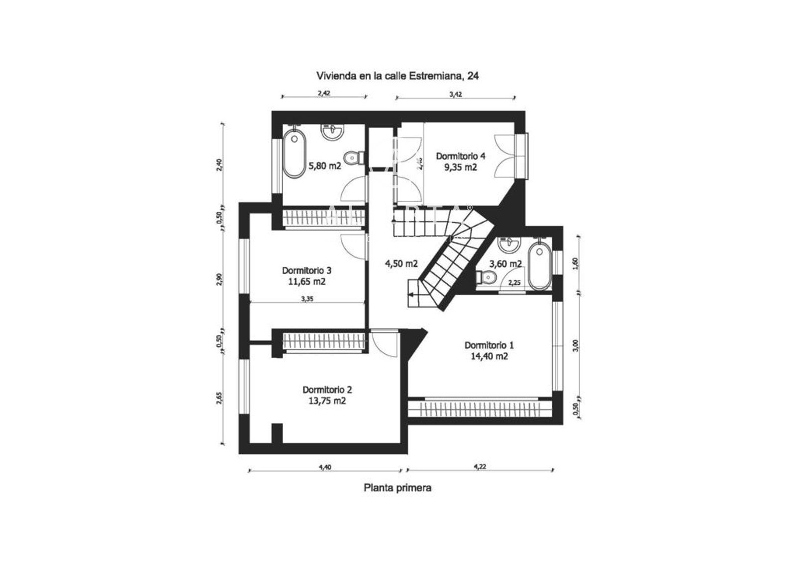 Planta Primera: Cuatro dormitorios y dos baños amplios con ventana, uno de ellos en suite. Acceso a solárium de 60 m2.